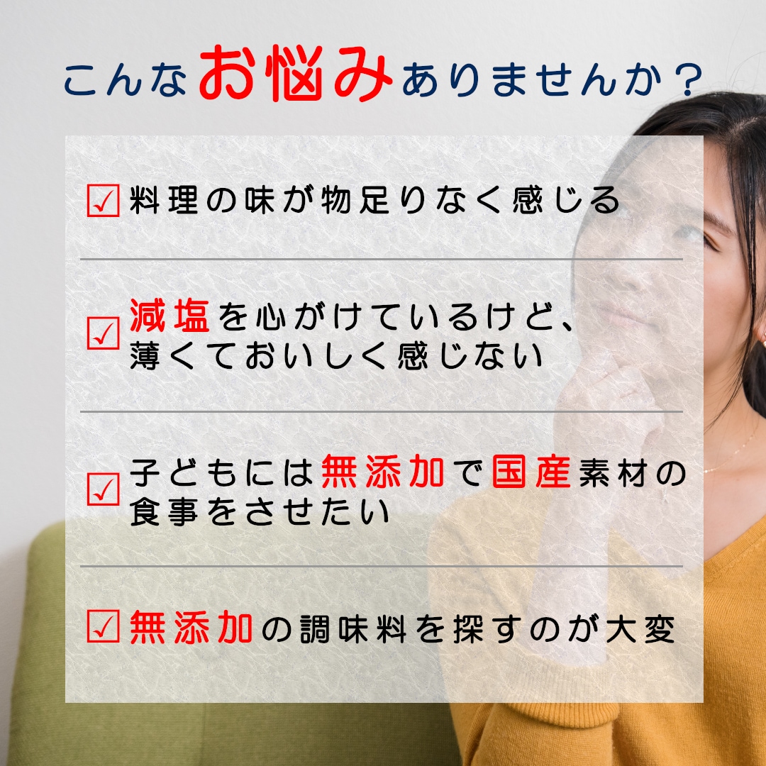 食塩や化学調味料、添加物も不使用。素材本来の旨みとコクが凝縮されています。
