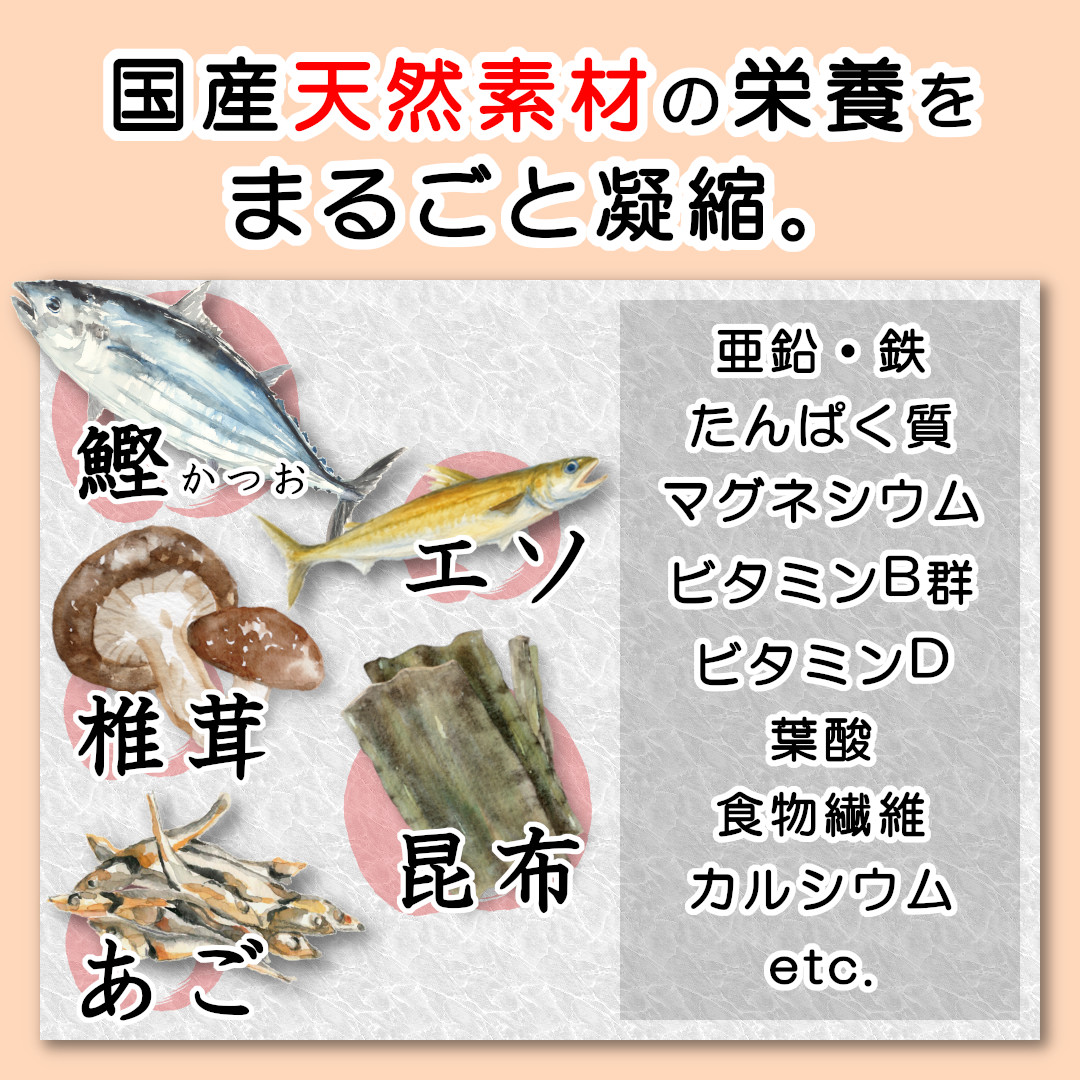 かつおのふし(国内産)、昆布粉末(国内産)、とびうお(国内産)、椎茸粉末(国内産)、えそ(国内産) |
