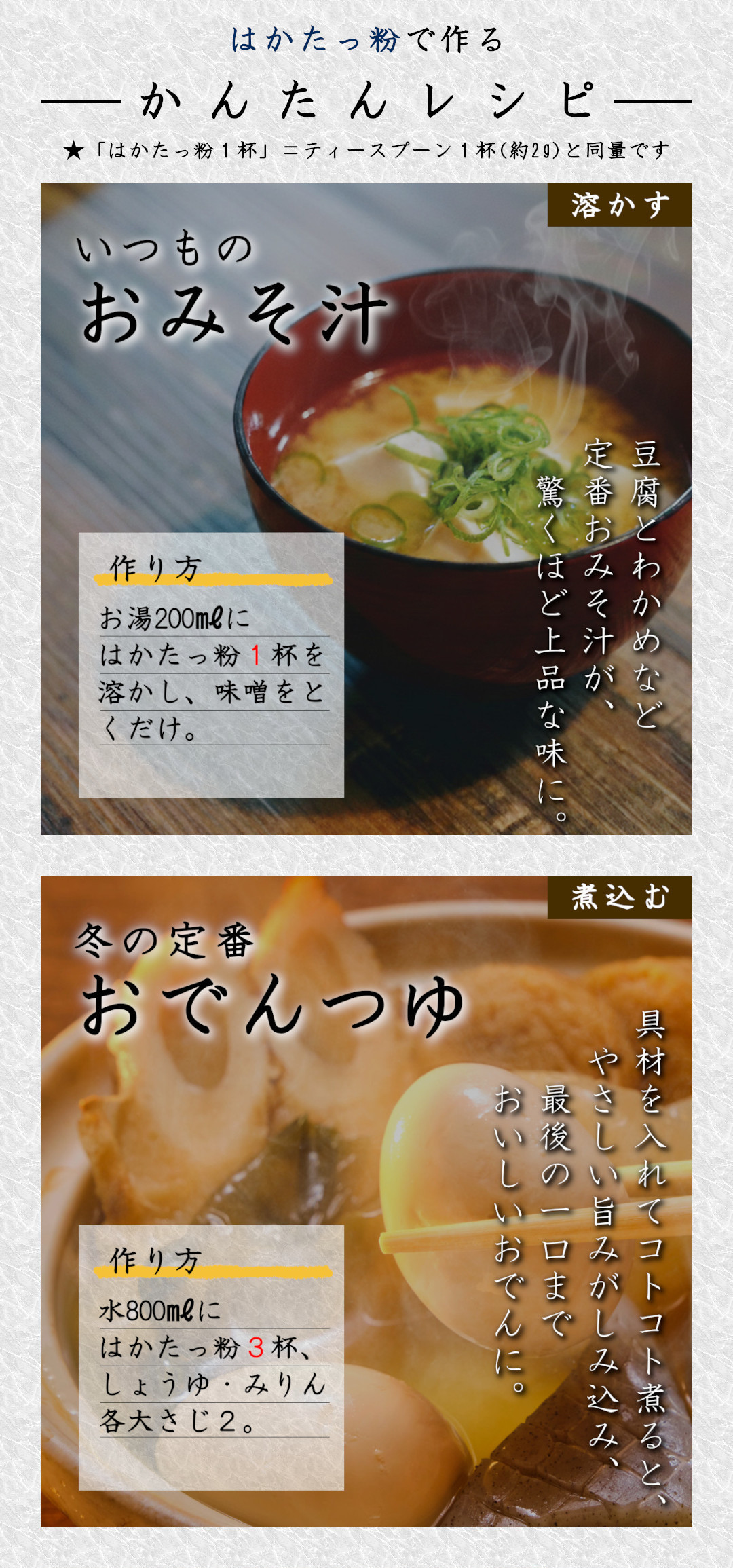 このだしは、選び抜かれた国内産原料のみとし、余計なものを一切加えていません。