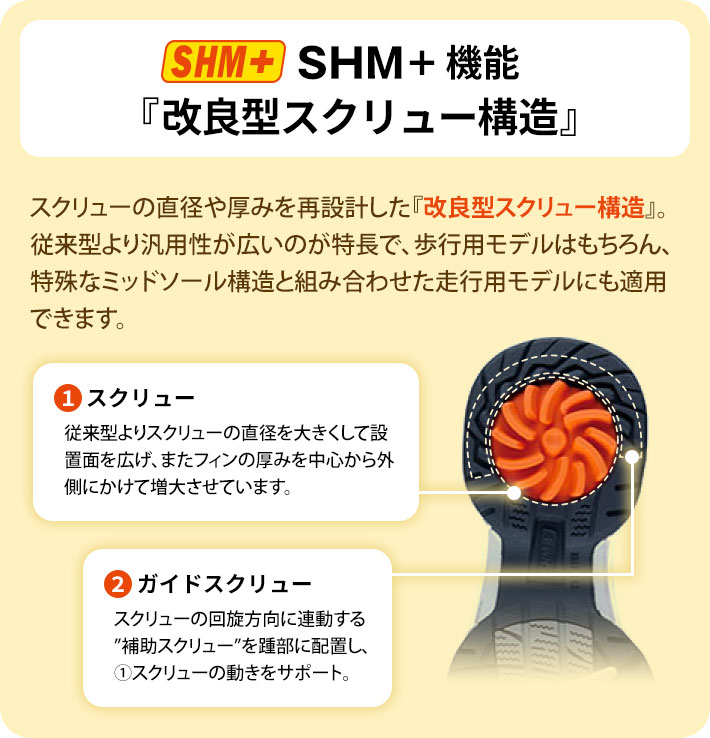 3.SHM®機能の靴底は踵部のゴムが可動することで機能を発揮しますので、多少摩擦音がでる場合があります。これは、ゴムと路面が擦れてでる音ですので、品質上は問題はありません。