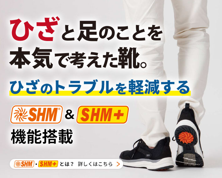 1.SHM®機能は、歩行時におけるひざ関節の正常な外旋運動を促進させるため、普段使われにくい筋肉を働かせる効果があり、履き始めにおいて太ももの筋肉に張りや疲労を生じることがあります。万一、履き馴れても持続的な筋肉の痛みや違和感がある場合は、すみやかにご使用を中止してください。