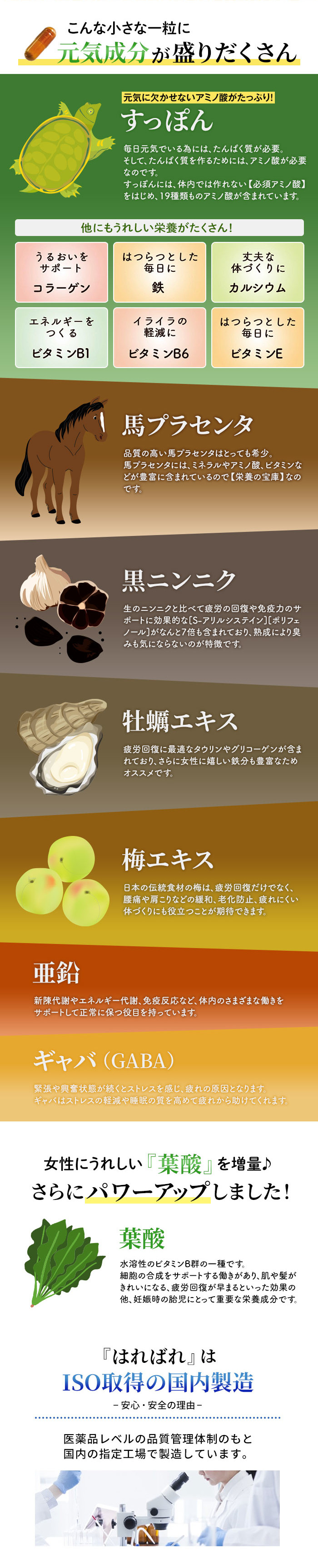 亜鉛含有酵母(アメリカ製造)、すっぽん粉末、醗酵黒ニンニクパウダー、うめエキス、デキストリン、大麦乳酸発酵液ギャバ、牡蠣エキス末、馬プラセンタエキス末/ゼラチン、グリシン、V.B1、結晶セルロース、二酸化ケイ素、ステアリン酸Ca、カラメル色素、V.C、抽出V.E、ナイアシン、パントテン酸Ca、V.B6、V.B2、V.A、葉酸、V.D、V.B12(一部にゼラチンを含む) |