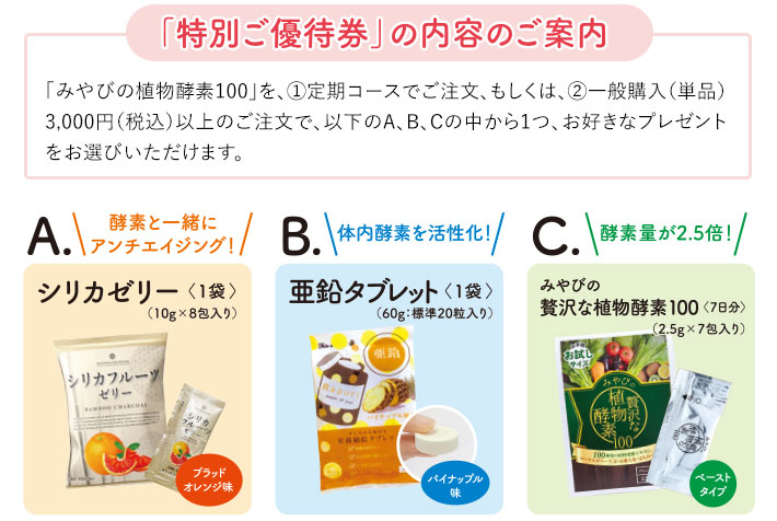 ¾åµ3¾¦ÉÊ¡¢¡ÖA. ¥·¥ê¥«¥¼¥ê¡¼¡×¡ÖB. °¡±ô¥¿¥Ö¥ì¥Ã¥È¡×¡ÖC. ¤ß¤ä¤Ó¤ÎìÔÂô¤Ê¿©Êª¹ÚÁÇ100¡×¤«¤é¤ª¹¥¤¤Ê¥×¥ì¥¼¥ó¥È¤ò¤ªÁª¤Ó¤¤¤¿¤À¤±¤Þ¤·¤¿¤é¡¢°Ê²¼¤ª¿½¤·¹þ¤ß¥Ü¥¿¥ó¤è¤ê¾¦ÉʤΤ´¹ØÆþ¤Ø¤ª¿Ê¤ß¤¯¤À¤µ¤¤¡£