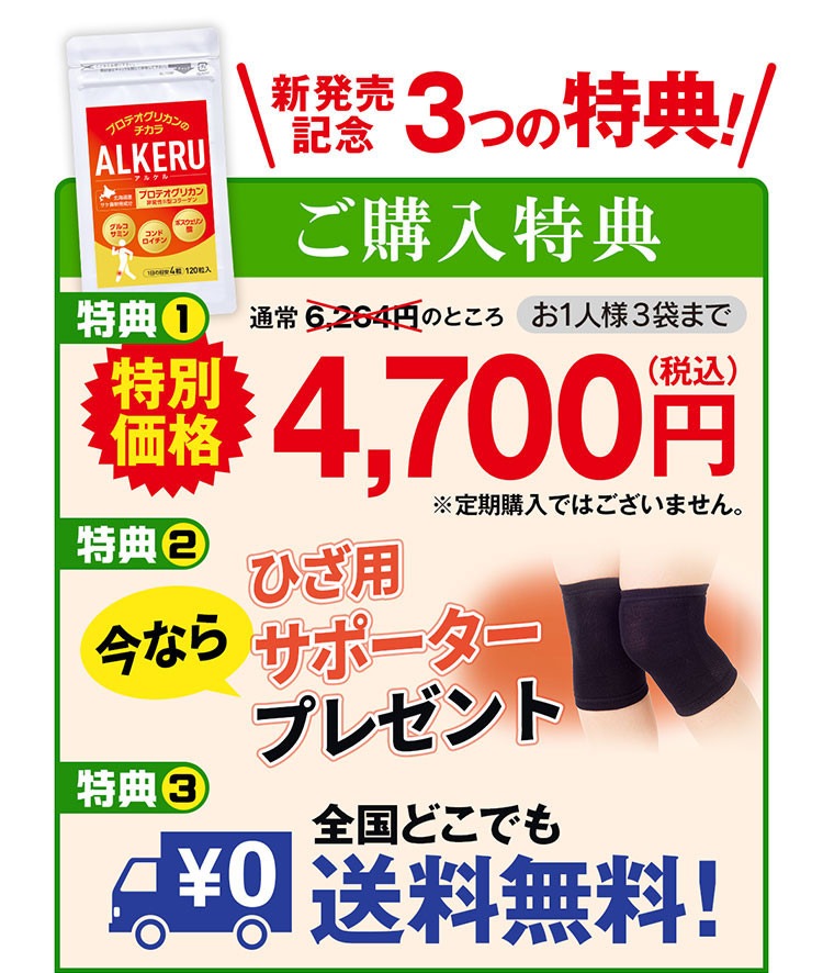 還元麦芽糖水飴(国内製造)、デキストリン、ボスウェリアセラタ抽出物、N-アセチルグルコサミン、鮭鼻軟骨、鶏軟骨抽出物、乳糖、筋骨草エキス末(デキストリン、筋骨草エキス)、西洋ヤナギ抽出物、モルトデキストリン / セルロース、ステアリン酸カルシウム、微粒酸化ケイ素、ビタミンC、ナイアシン、パントテン酸カルシウム、ビタミンB1、ビタミンB6、ビタミンB2、ビタミンB12(一部にエビ・カニ・ゼラチン・乳成分を含む) |